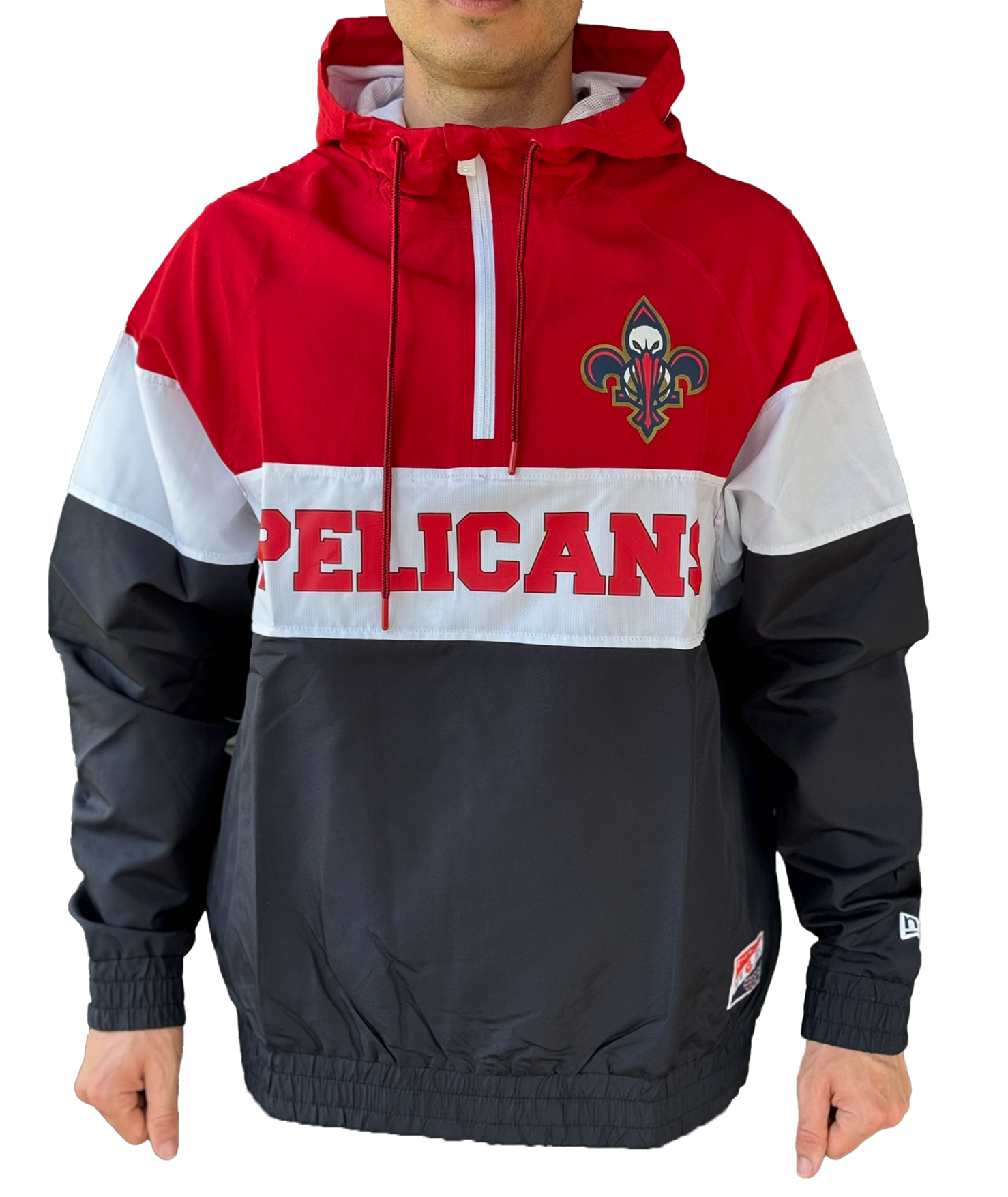 The New Orleans Pelican wind breaker features the primary logo in red and the fleur de pelican logo on the left chest. The top half of the jacket is red, the white section featuring "Pelicans" in red while the bottom half is navy.