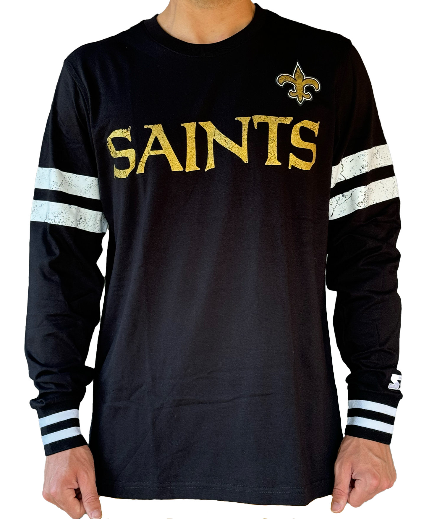 Expertly crafted from 100% cotton, this New Orleans Saints men's long sleeve tee is the perfect way to show your team pride. The distressed "SAINTS" design adds a vintage touch, while the striped sleeves add a stylish twist. Whether at the game or out and about, this tee is sure to make a statement.