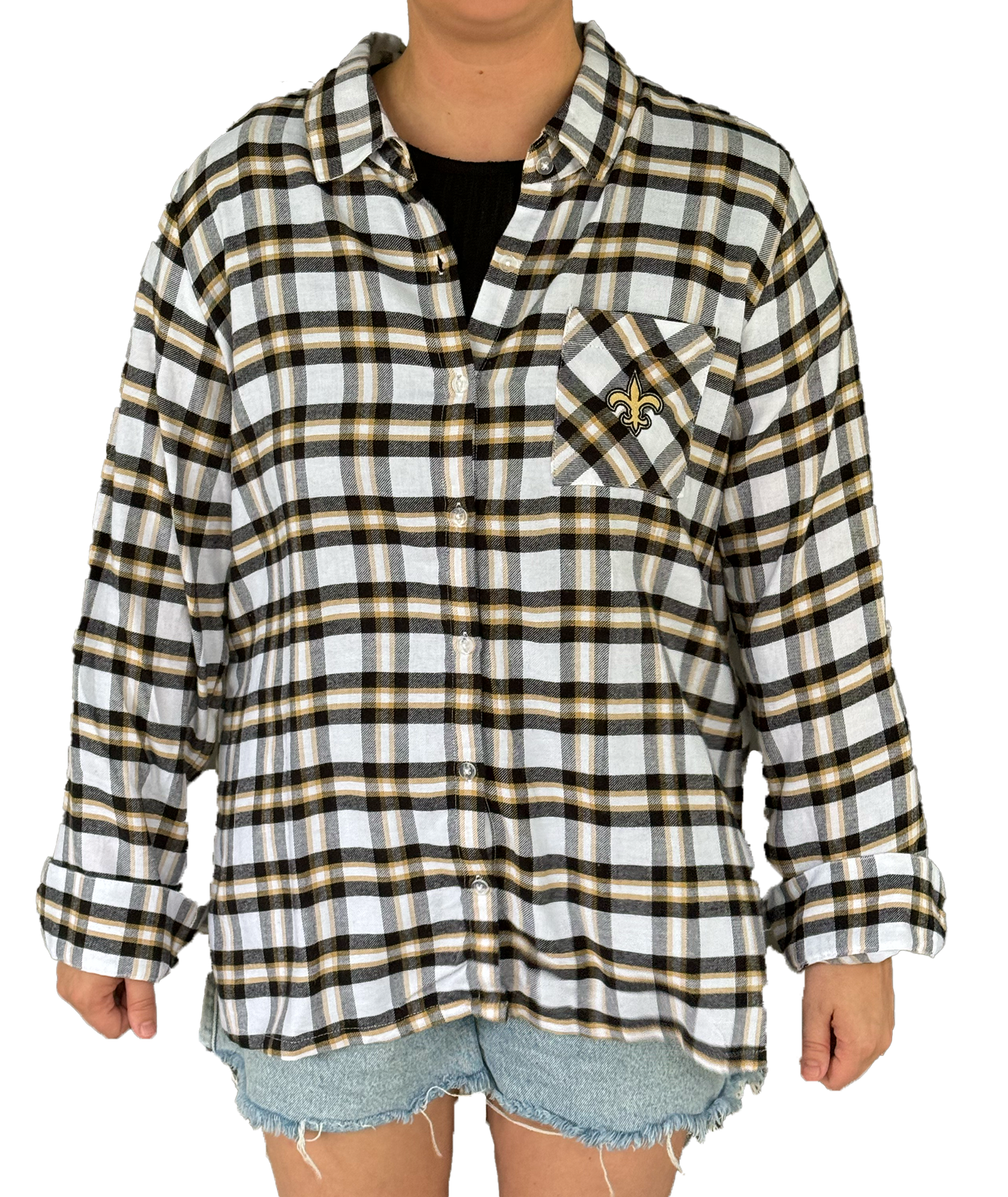 flannel with a white, black and a little gold with a left chest pocket. The pocket has a gold, stitched fleur de lis